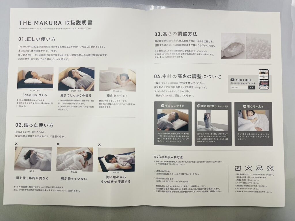 10年近く愛用していると、正しい枕の使い方が抜けちゃうので、丁寧に書いてあるのは非常に嬉しいですよね。