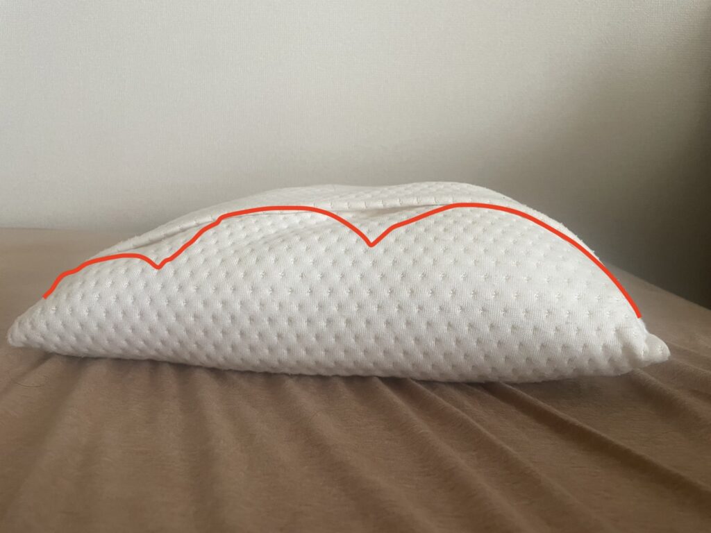 最初に枕の向きを確認します。逆向きになっているとキュアレ枕の本来の効果が発揮されません。細い山が肩、太い山が頭を支えてくれます。