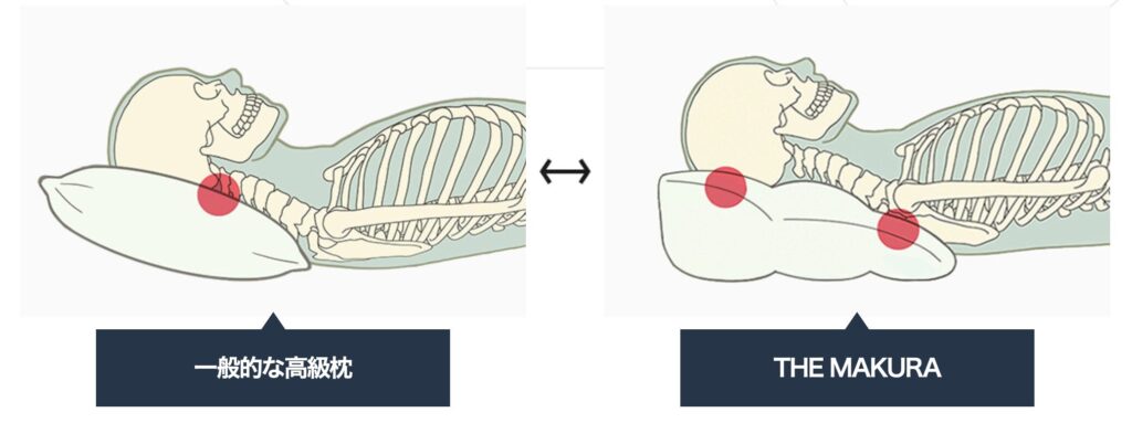 キュアレの枕、THE MAKURAの場合、頭や首だけでなく肩回りまで乗るように設計されていて、頸椎にかかる負担がなくなり、脳からの信号が届きやすくなります。