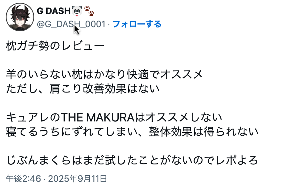 初めにキュアレの枕、THE MAKURAに関する良い口コミをご紹介します。