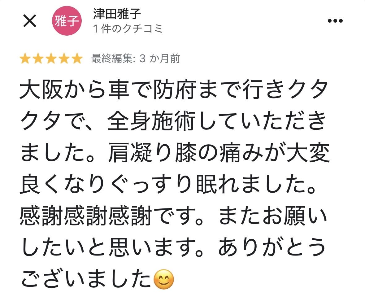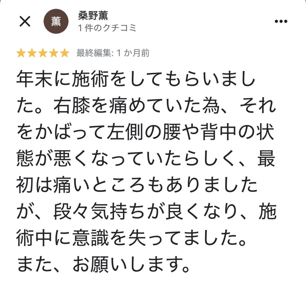 先ほど、整体サロン〜ゆったり〜の施術を受けた方の口コミを拝見しましたが、患者様の喜びの声が沢山ありました。※2026年2月時点