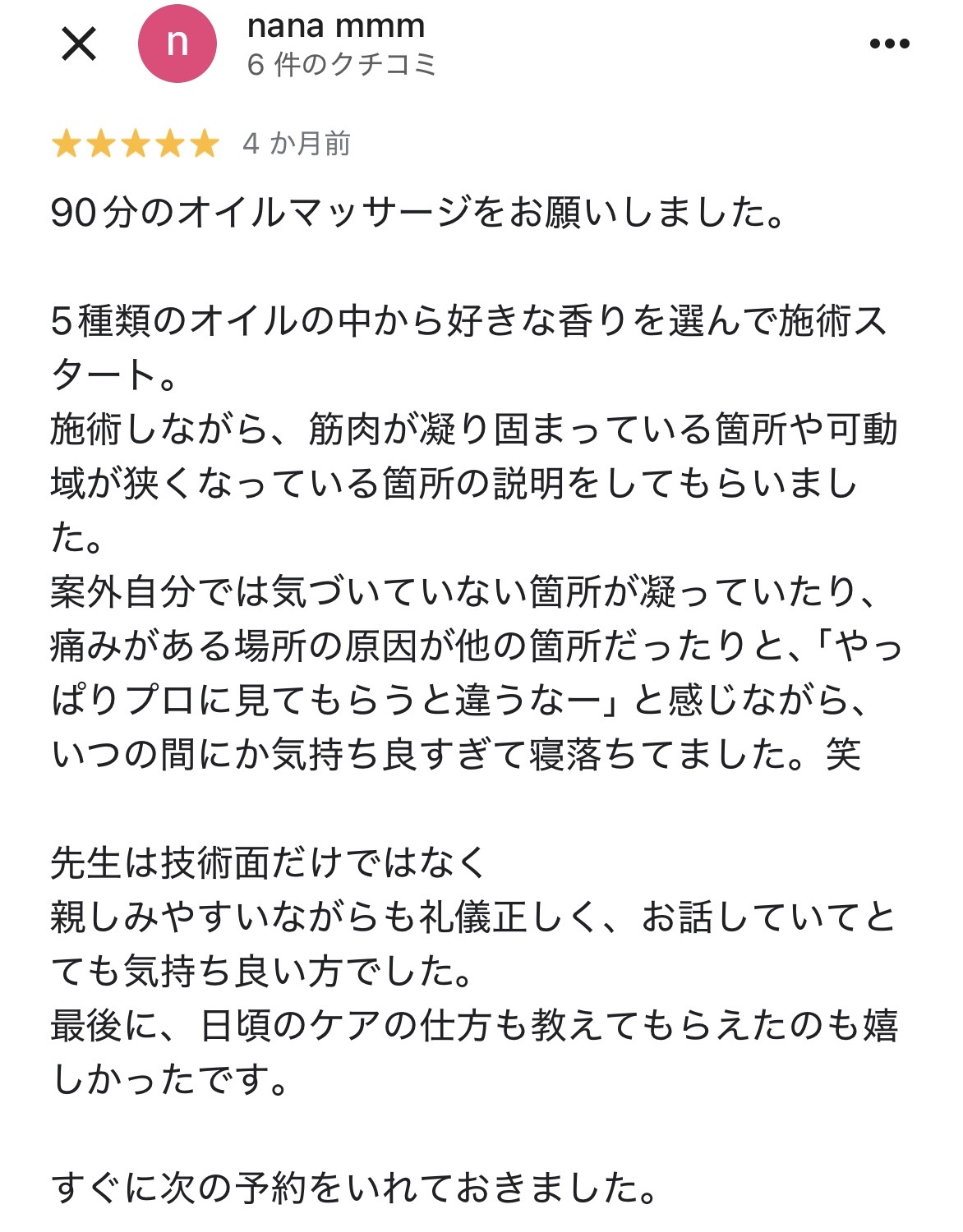 懐に入る距離感のスキルに自信があるってすごいですね!不快にならずにいい距離感でいてくださるのは、患者様からすると安心でしょうし、心身ともにリラックスしながら施術を受けられるんだろうなと思います。また、さまざまなサービスがあって、自分にあったサービスを選択できそうですね。