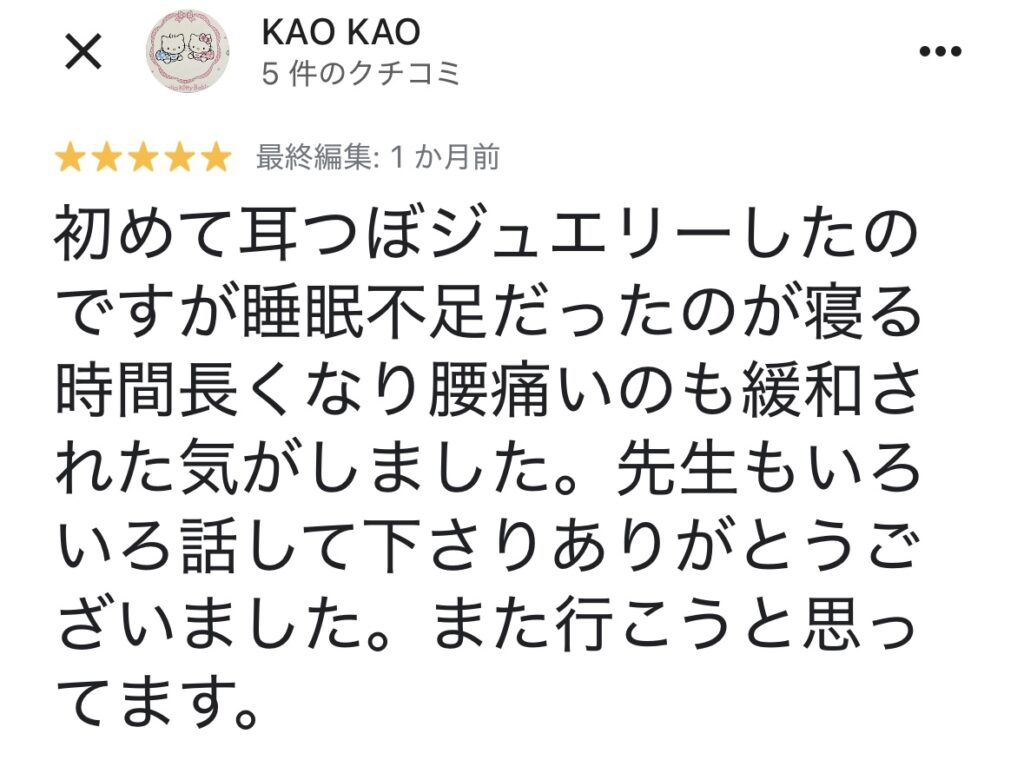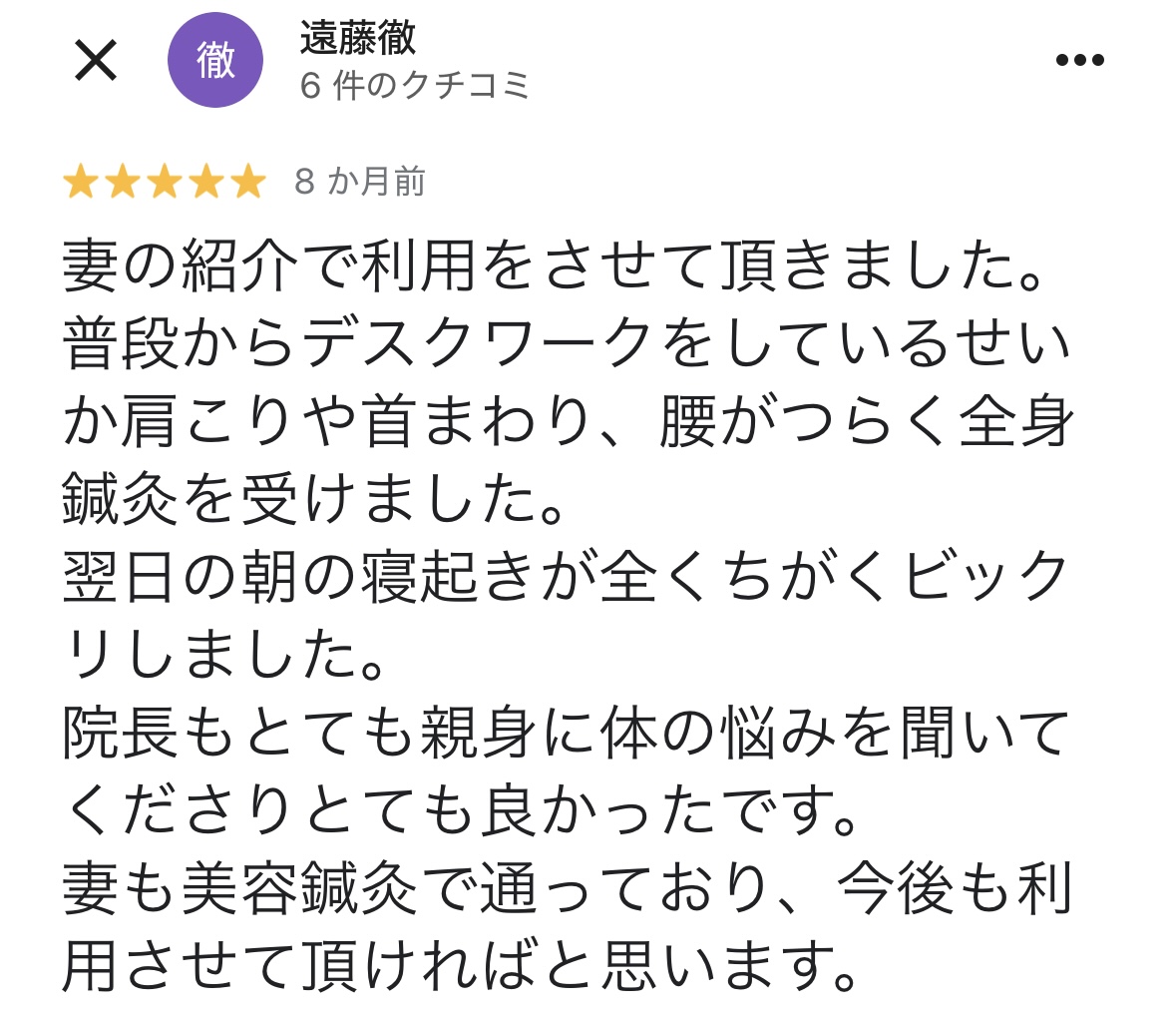 先ほど、鍼灸院まめの施術を受けた方の口コミを拝見しましたが、患者様の喜びの声が沢山ありました。※2025年11月時点
