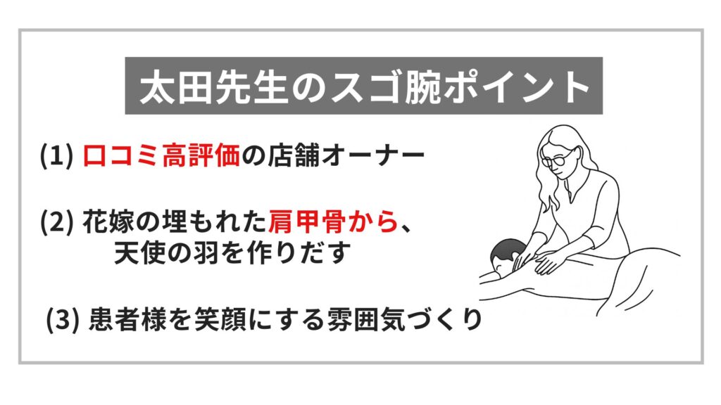 現在は、埋もれた肩甲骨を引き出す独自の施術で、花嫁さんを中心に多くの女性の「人生最高の日」に寄り添っています。OTA整体院の太田先生は、技術と想いの両方で人を笑顔にする「ブライダル整体師」です。