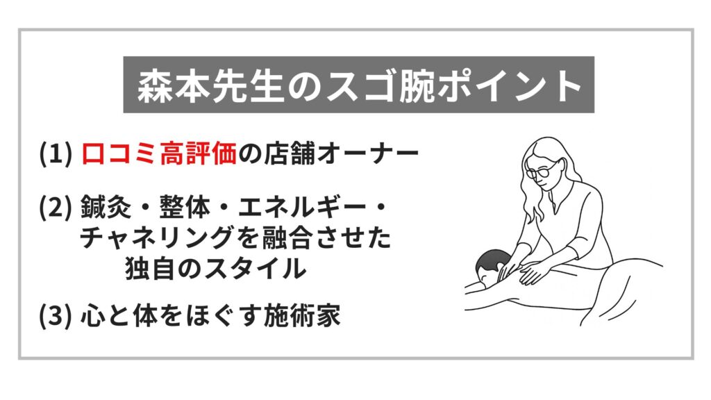 身体を整えることで心は整い、心がほどければ身体も自然に弛む。その瞬間を何度もみてきた森本先生の施術には、技術を超えた温度があります。