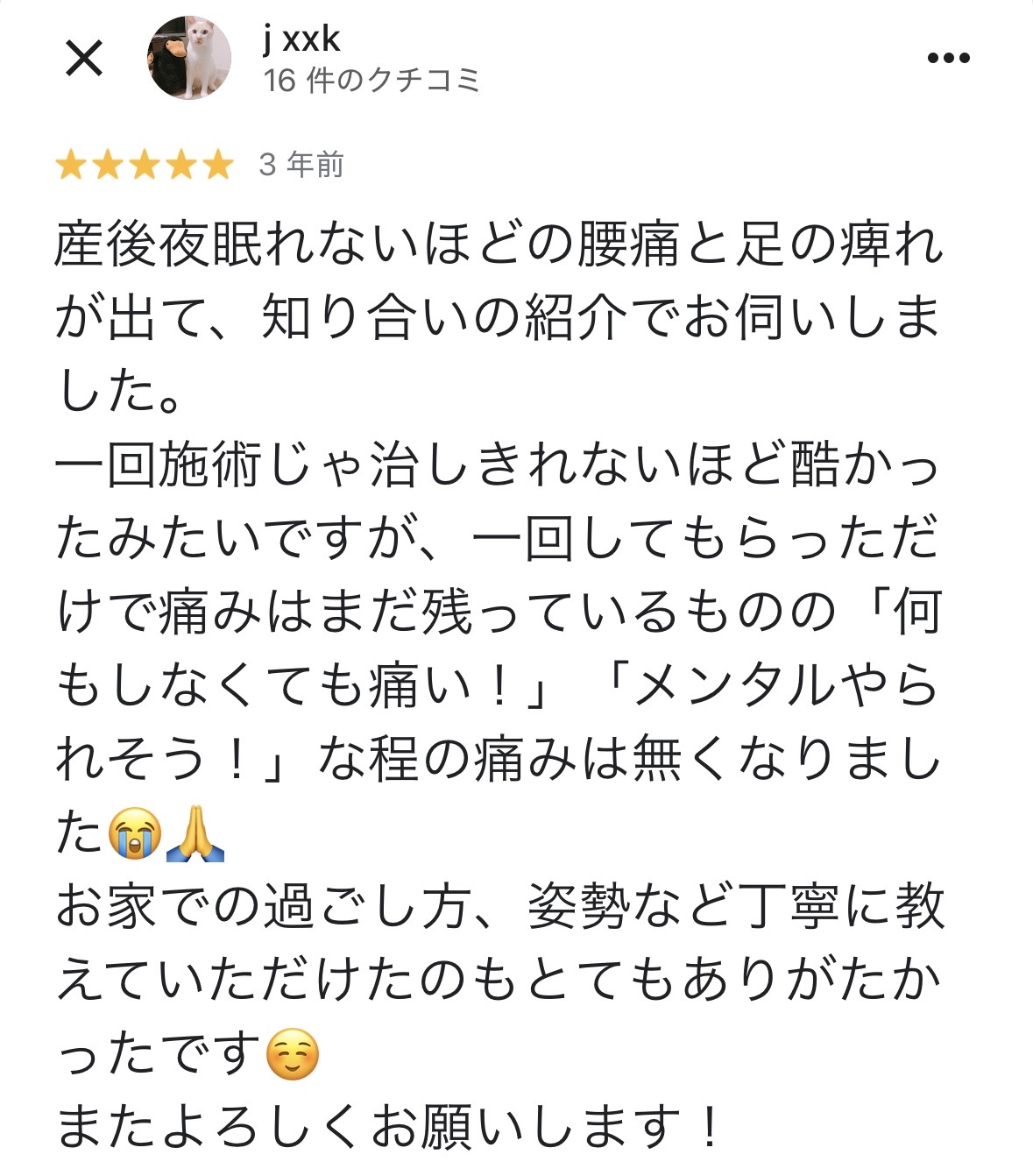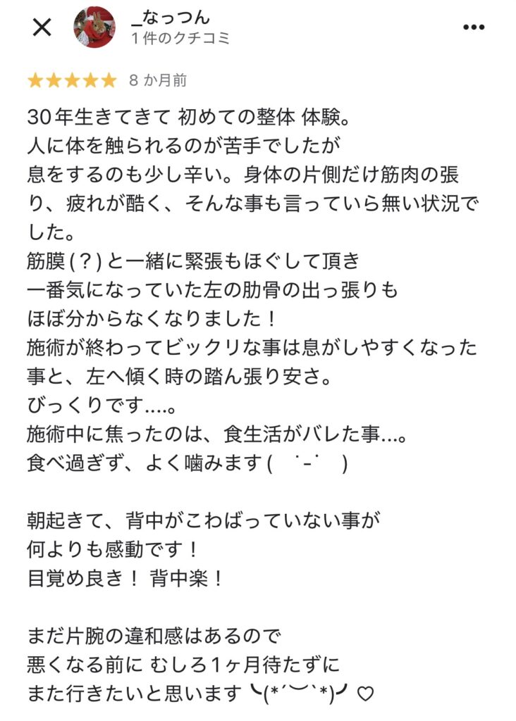 先ほど、整体院しろくまの施術を受けた方の口コミを拝見しましたが、患者様の喜びの声が沢山ありました。※2026年1月時点