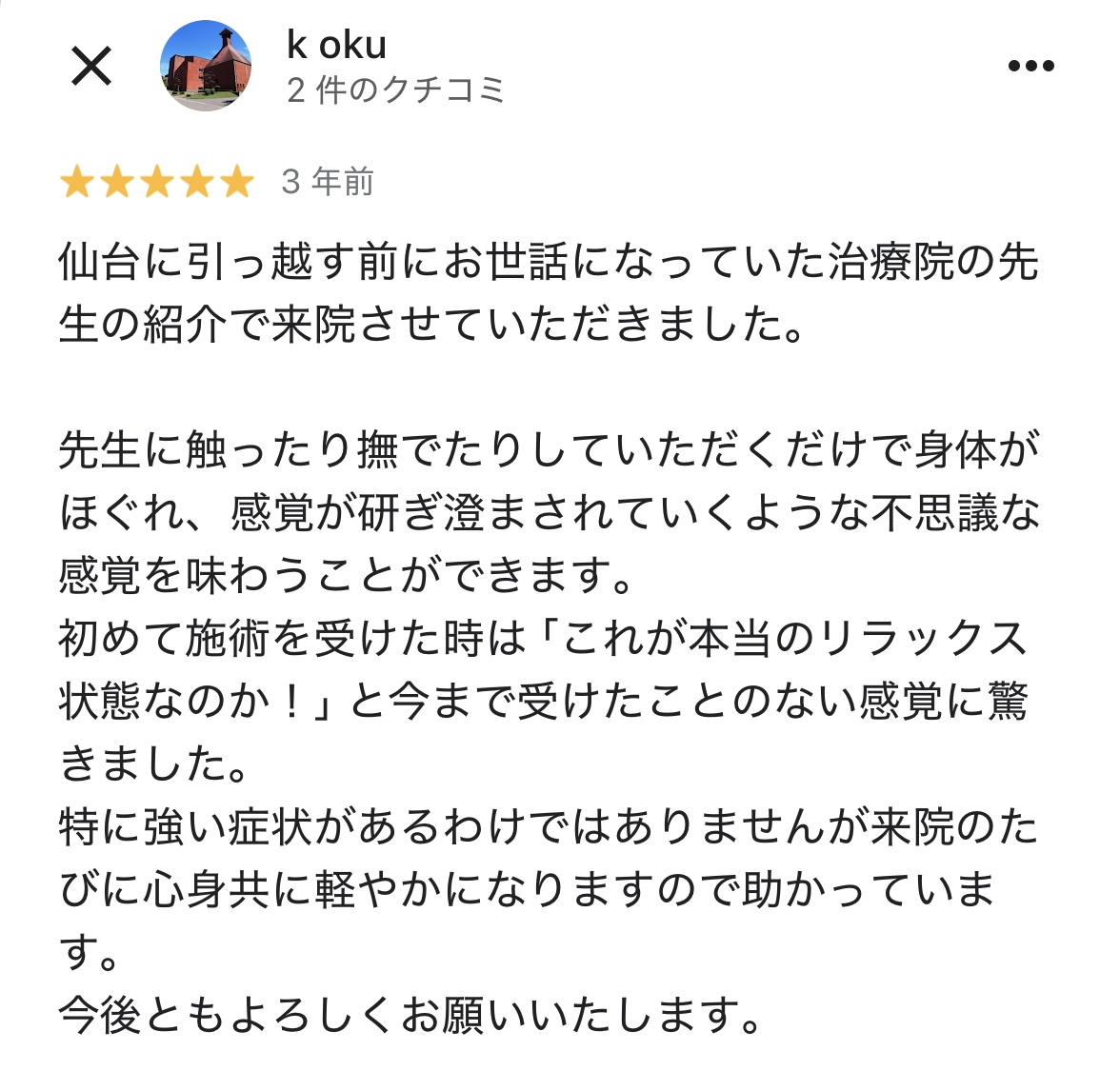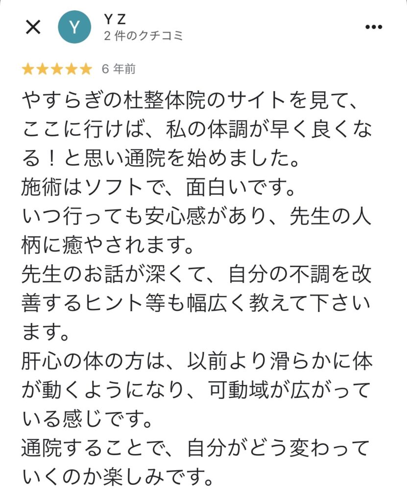先ほど、やすらぎの杜整体院の施術を受けた方の口コミを拝見しましたが、患者様の喜びの声が沢山ありました。※2025年12月時点