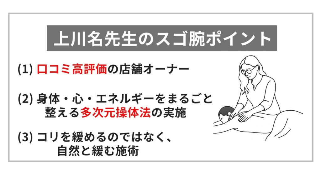 上川名先生のお店で体験できる手技の特徴を教えていただけますか?