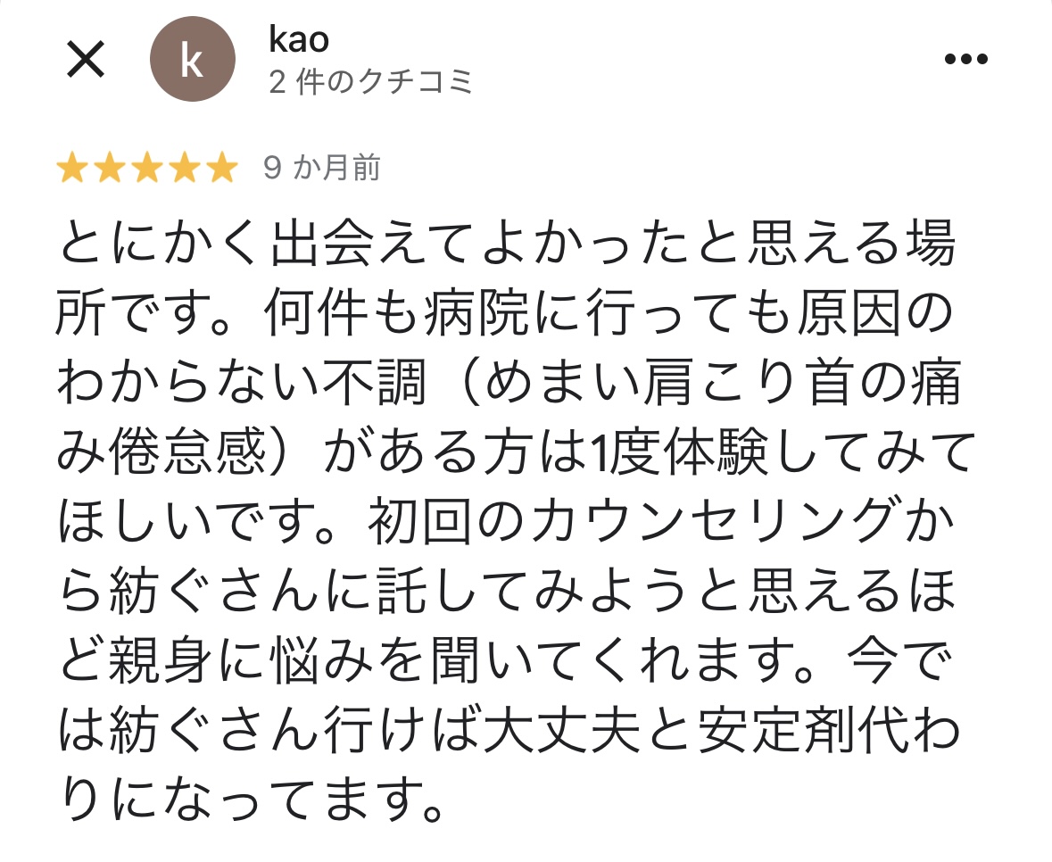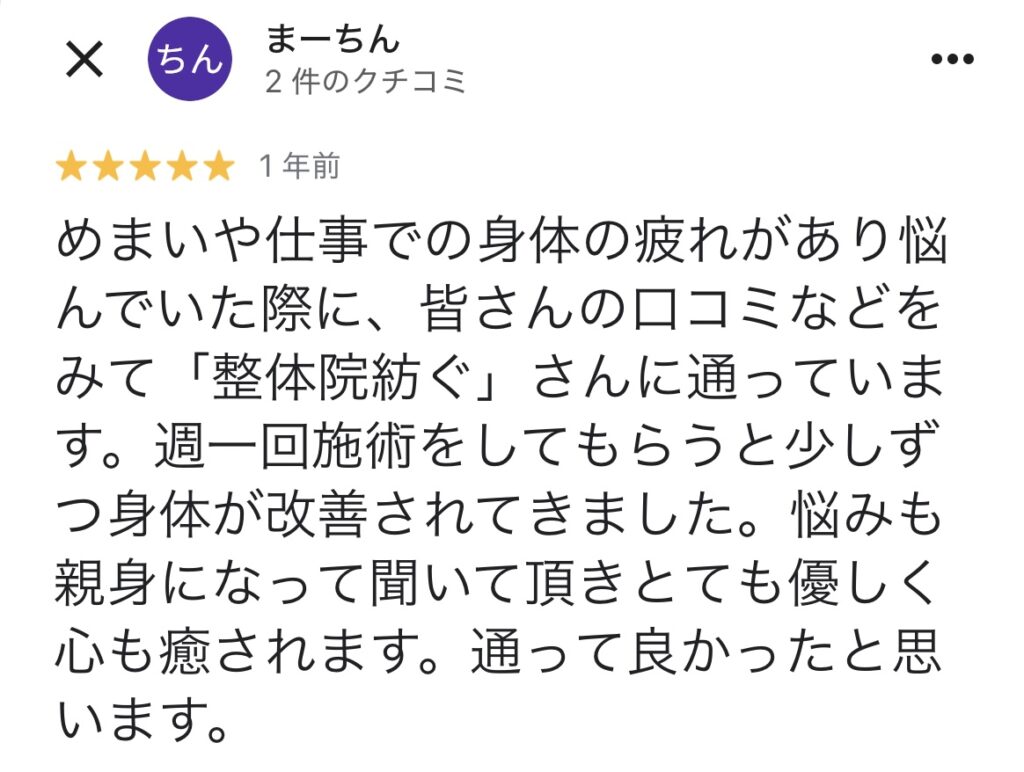 先ほど、整体院 紡ぐの施術を受けた方の口コミを拝見しましたが、患者様の喜びの声が沢山ありました。※2025年11月時点