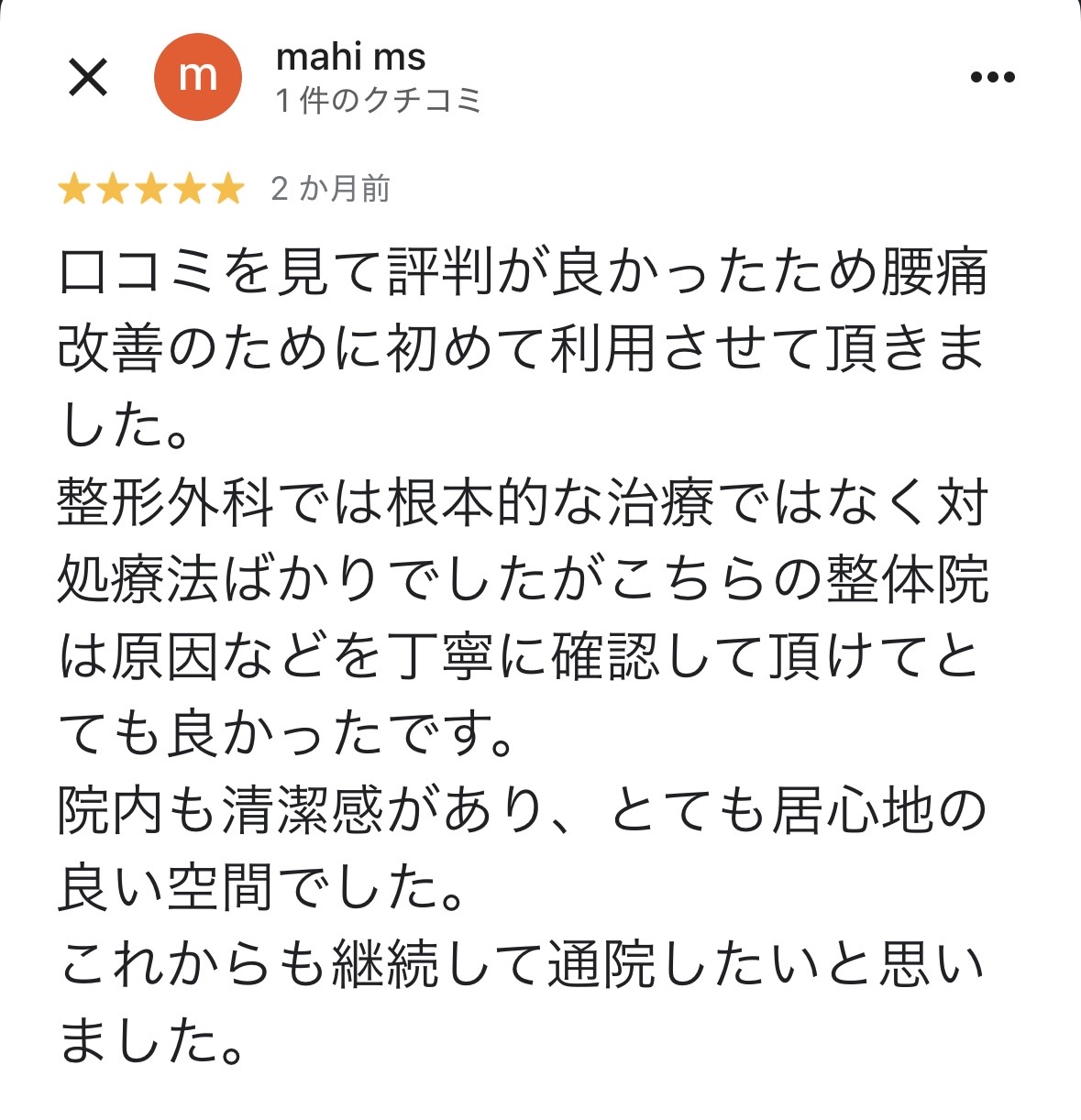 先ほど、私たちの施術や提供する空間の施術を受けた方の口コミを拝見しましたが、患者様の喜びの声が沢山ありました。※2026年3月時点